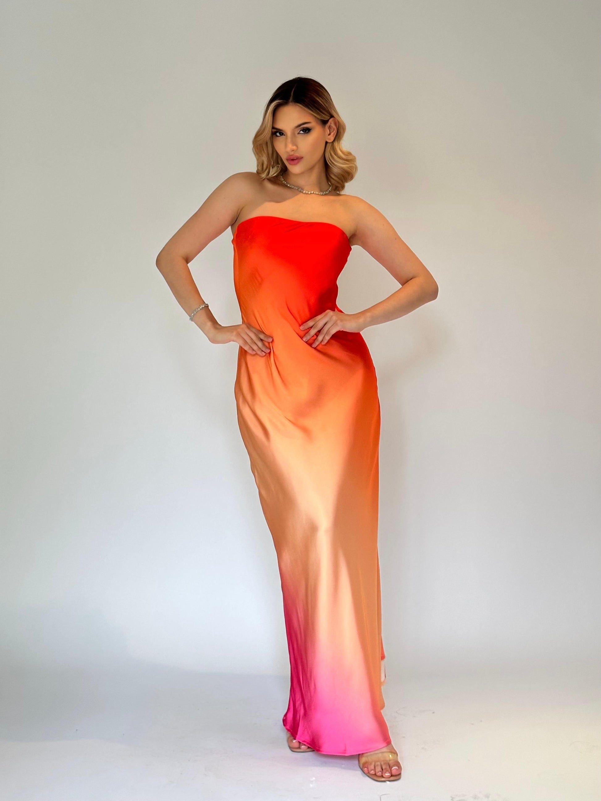 Vestido largo de satén con escote palabra de honor y efecto degradé en tonos cálidos que van del coral intenso al marfil. Su silueta al cuerpo y caída fluida lo convierten en una pieza sofisticada y femenina, perfecta para eventos especiales donde quieras destacar con elegancia y frescura. Combínalo con accesorios dorados para un look radiante.