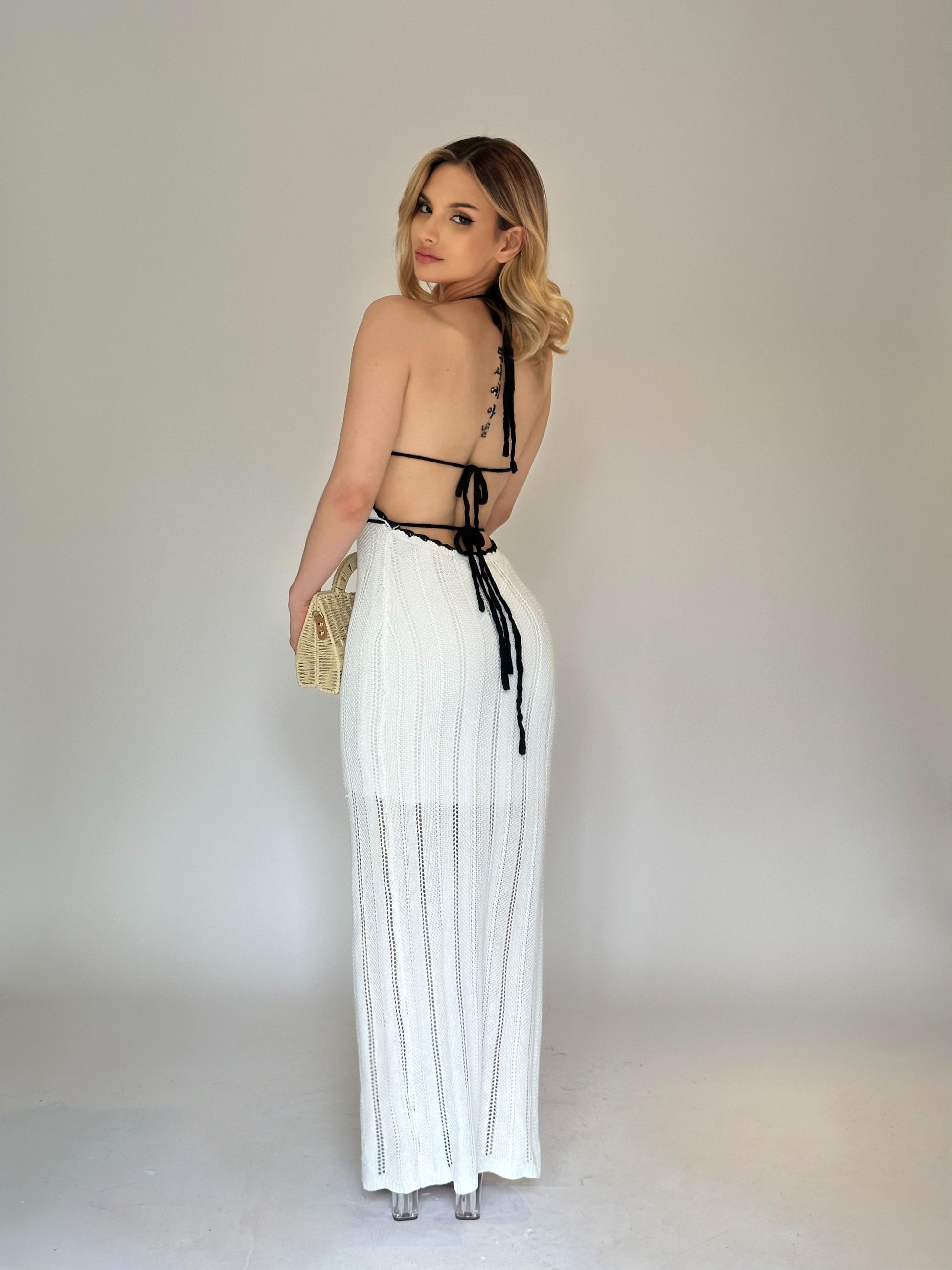 Este vestido tejido en blanco con contraste negro y espalda descubierta está hecho para escapadas al mar, brunchs con amigas o fiestas sunset con estilo.
