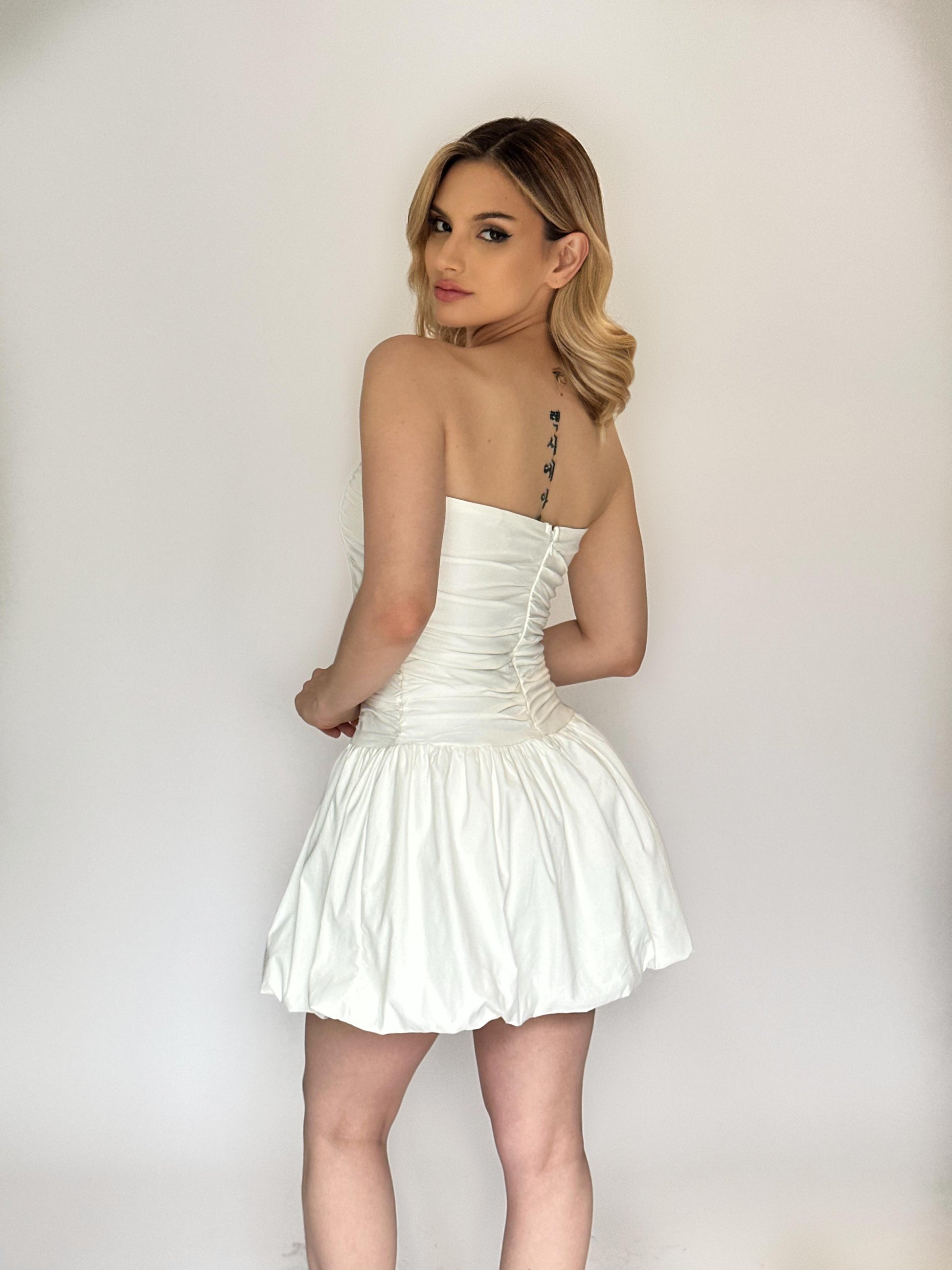 Este mini vestido strapless tipo globo es perfecto para citas, celebraciones de día, fiestas, pre-bodas o cualquier ocasión donde quieras brillar con un look fresco, moderno y femenino.
