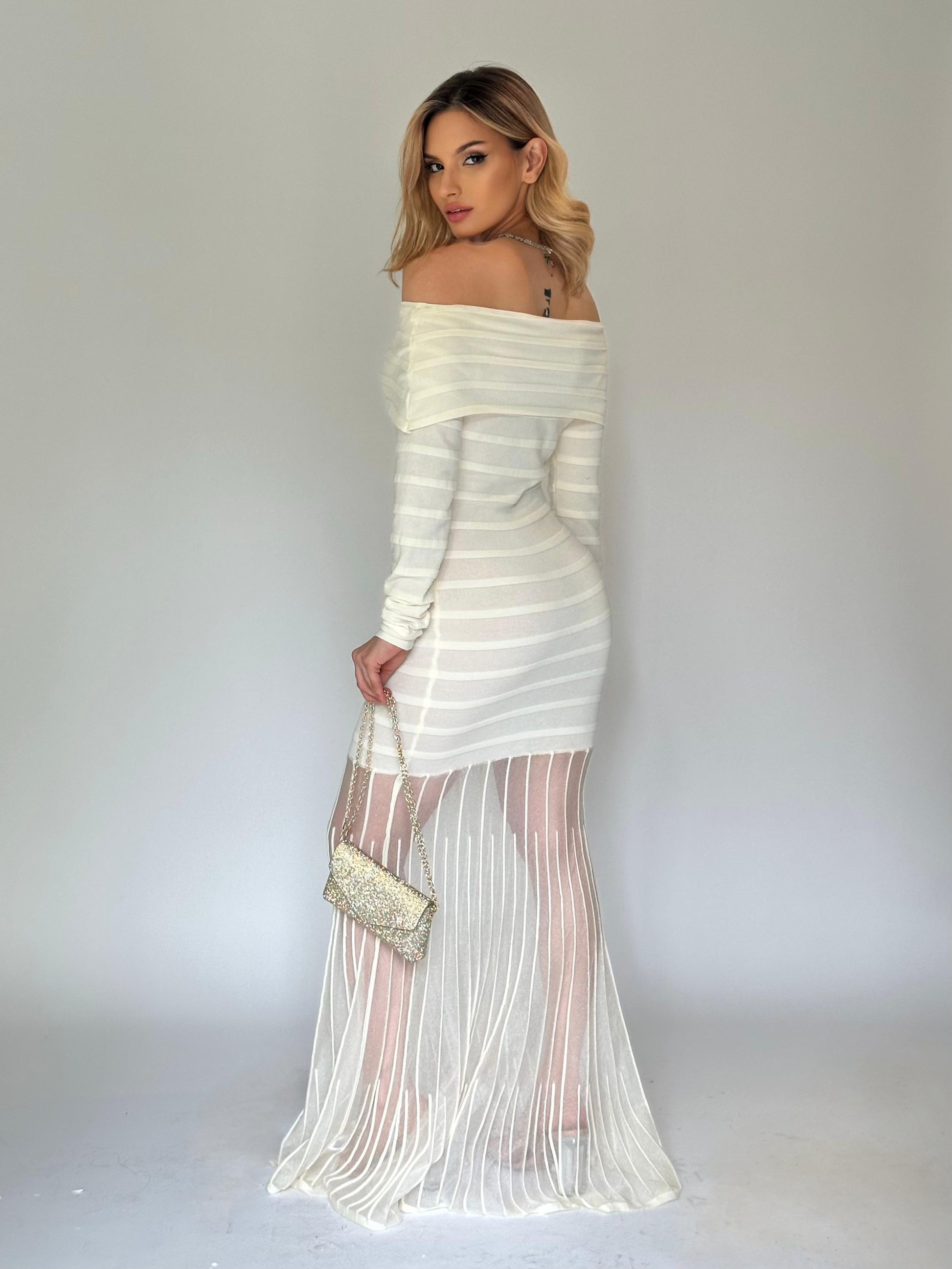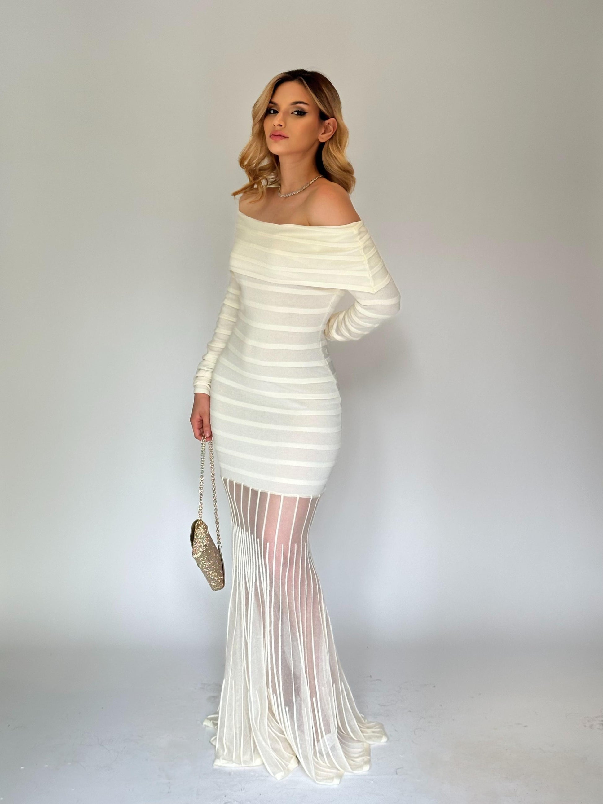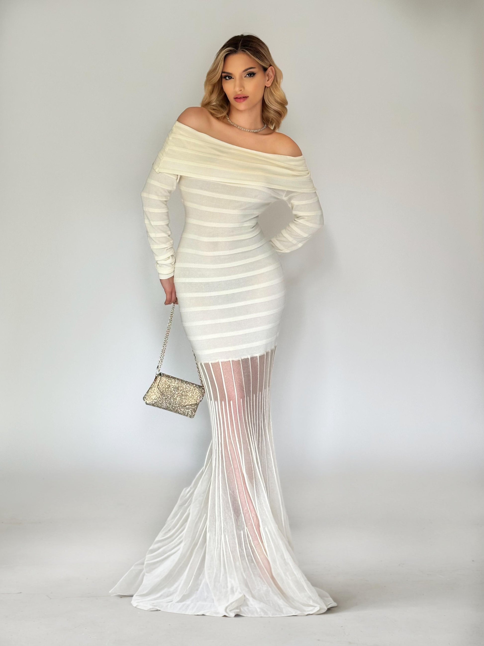 Este vestido off-shoulder con transparencias sutiles y silueta entallada es ideal para cenas formales, fiestas exclusivas o eventos donde el dress code exige elegancia… con un toque atrevido.