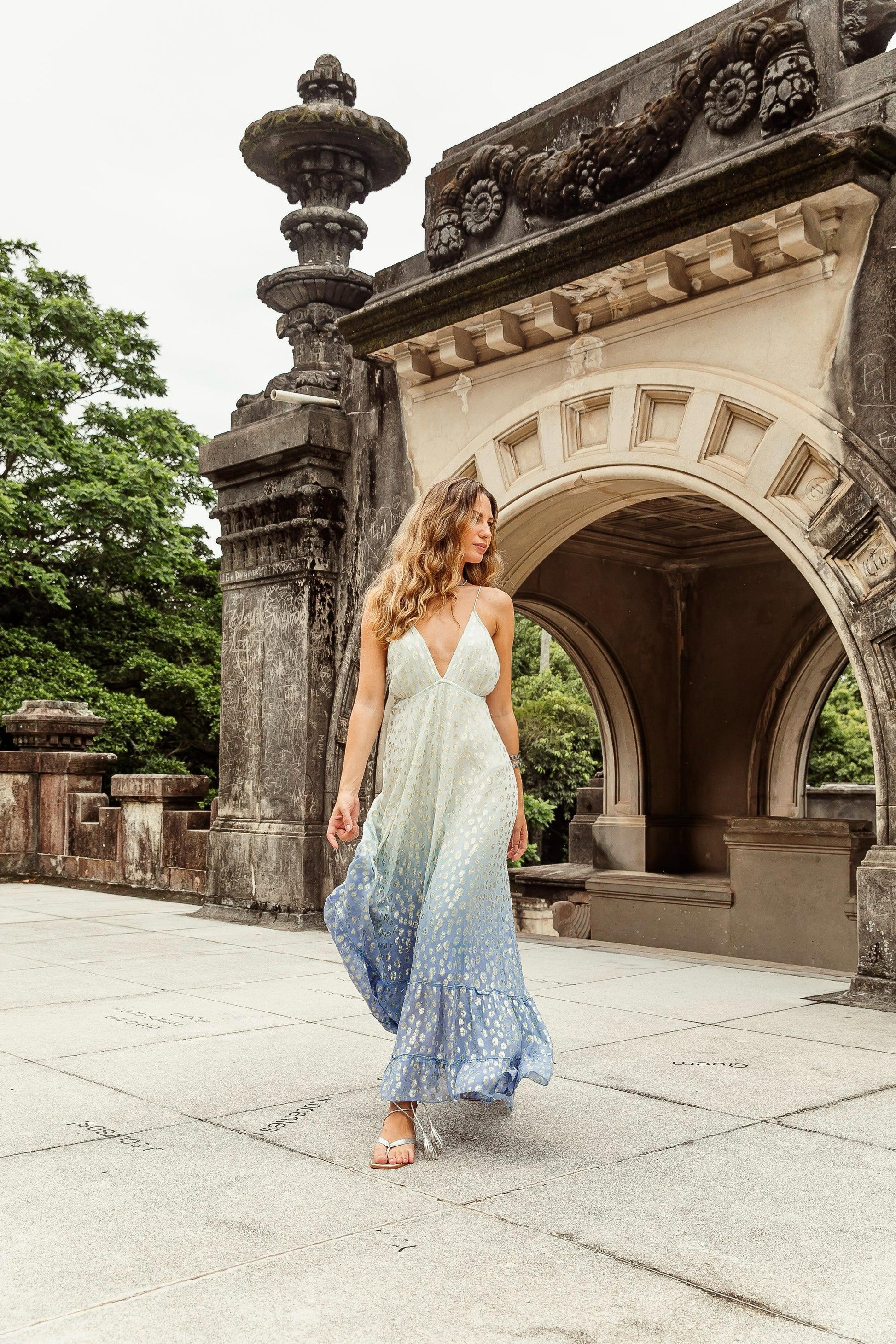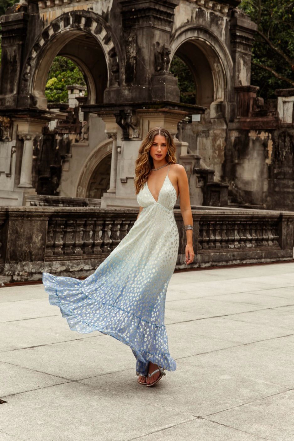 Con escote en V profundo y espalda abierta con tirantes ajustables, este vestido es ideal para brillar con elegancia en eventos especiales o escapadas de ensueño.