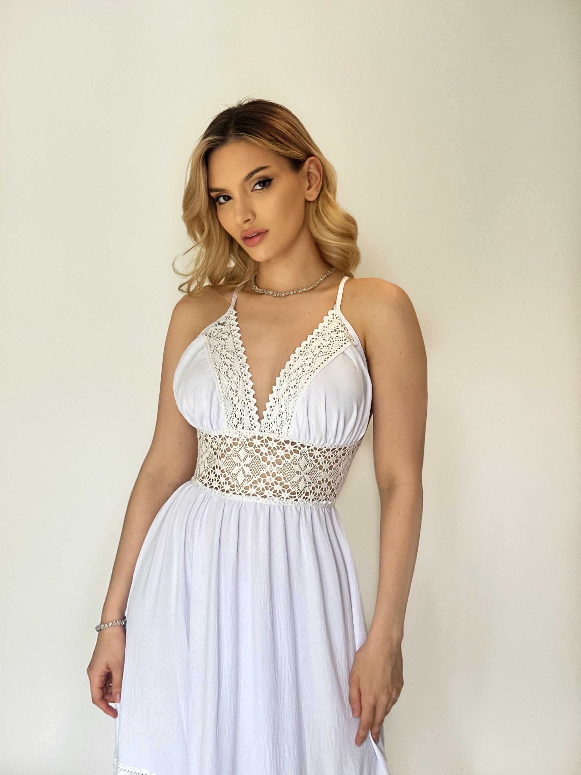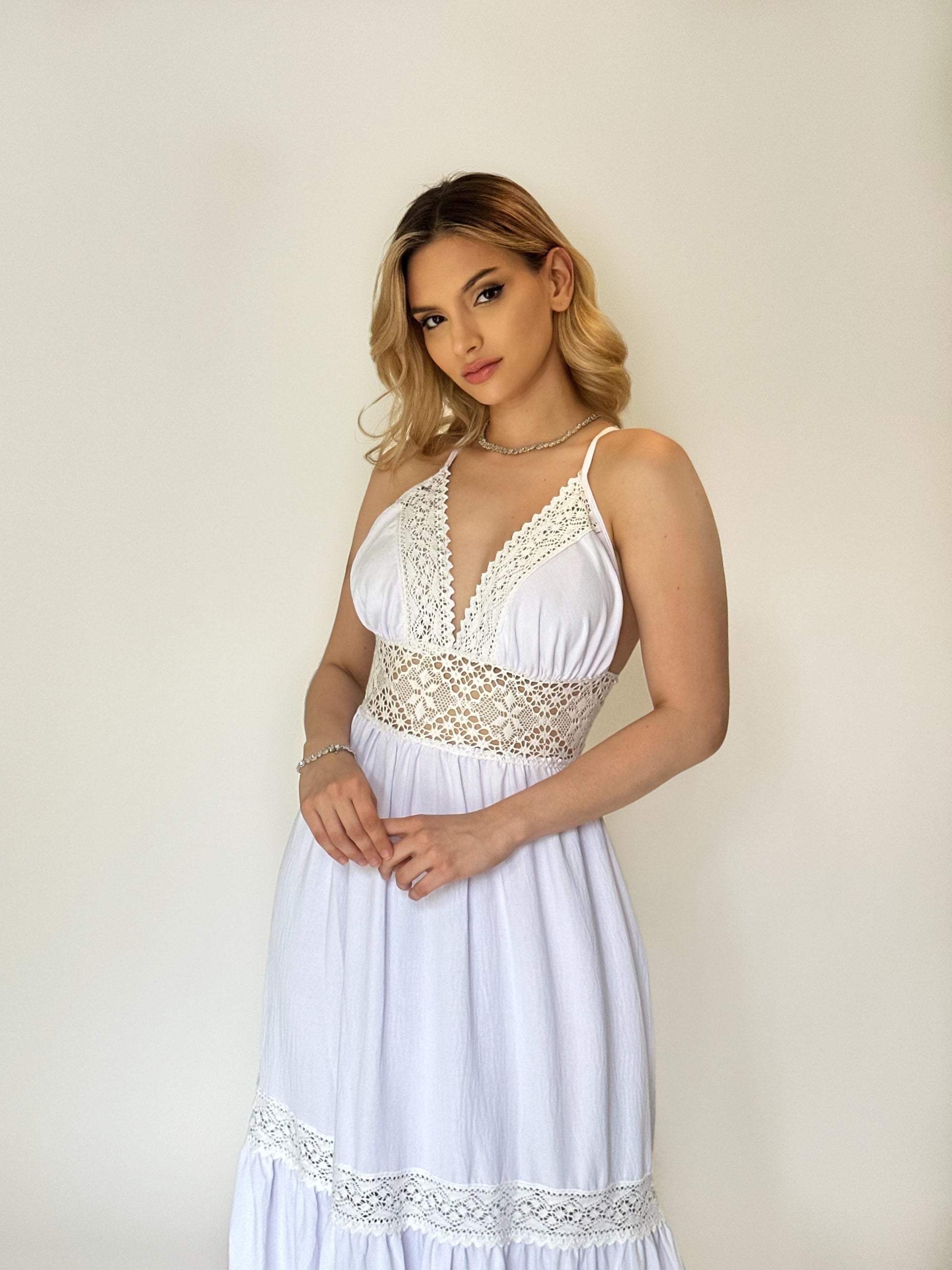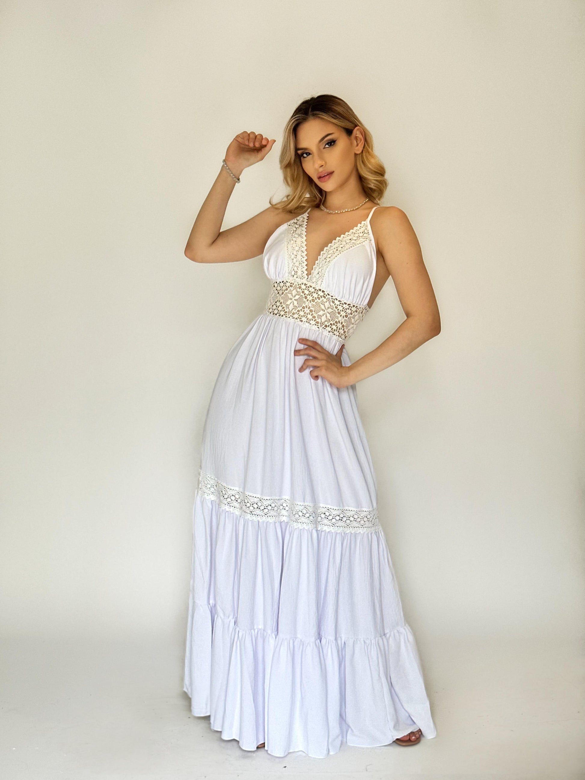 Este vestido blanco largo con encaje, escote en V y espalda descubierta es perfecto para brunchs, vacaciones, celebraciones de día o incluso como opción para una novia bohemia.